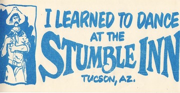 Scan of a bumper sticker given out to promote Country Swing dance lessons held at the Stumble Inn, Tucson, Arizona, during the late 1970s and early 1980s. “Dancing Dan" Gaul (one of my apartment-mates for a time) ran the classes, and after I became a good enough country-swing dancer I even taught a few classes myself.